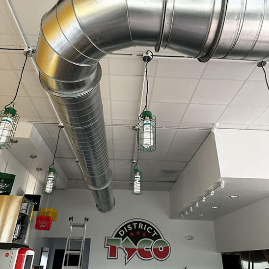 A kitchen redesign created new airflow challenges. We updated the restaurant’s ventilation system to include a new smart-flow system integrated with a smart, energy-efficient thermostat system. Per the owner’s request, we also went with a polished nickel, exposed appearance that worked beautifully with the restaurant’s design aesthetic.